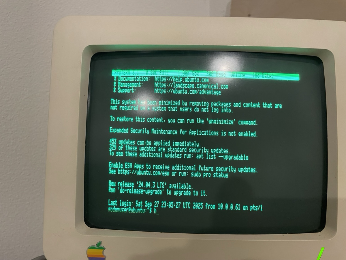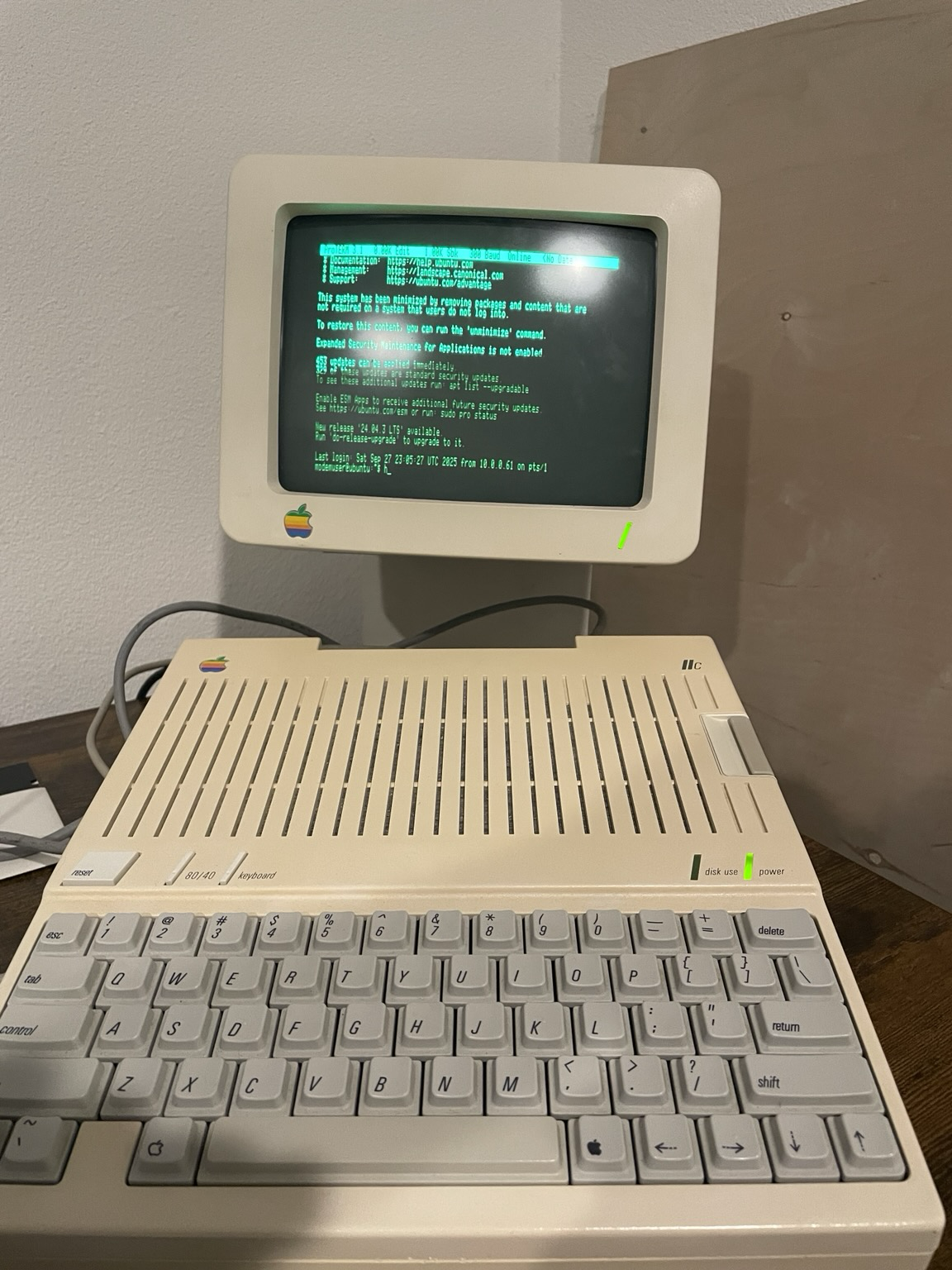 I am fixing up my workshop in the garage and needed a way to hook up my Apple IIc to my network to exchange files so I figured setting up a Ubuntu VM running lrsz and using a WiFi modem to exchange files via Proterm would work.